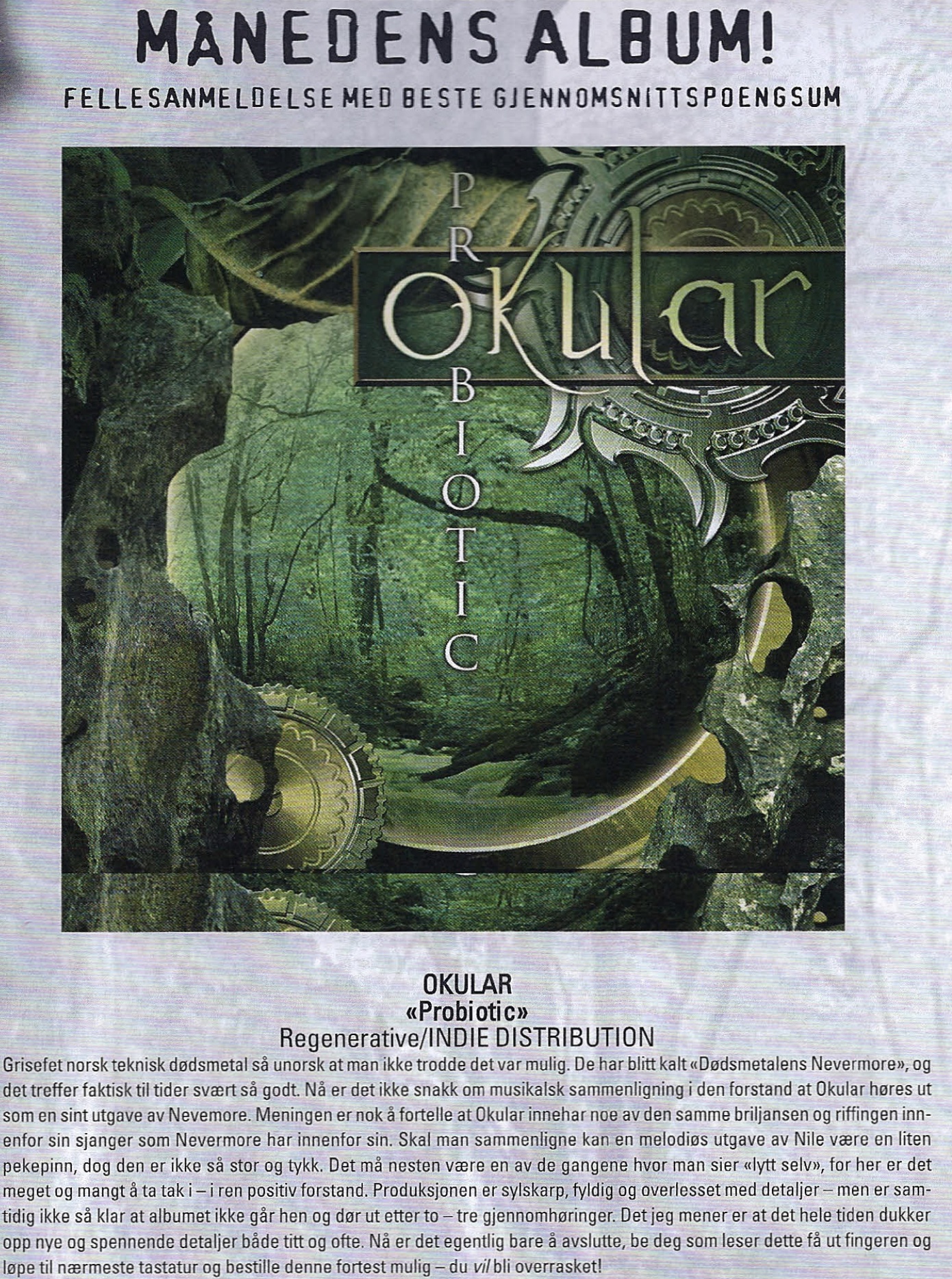 "Okular is death metal’s Nevermore mixed with Mercenary" (Anders Peter Jørgensen, Voices From the Darkside)